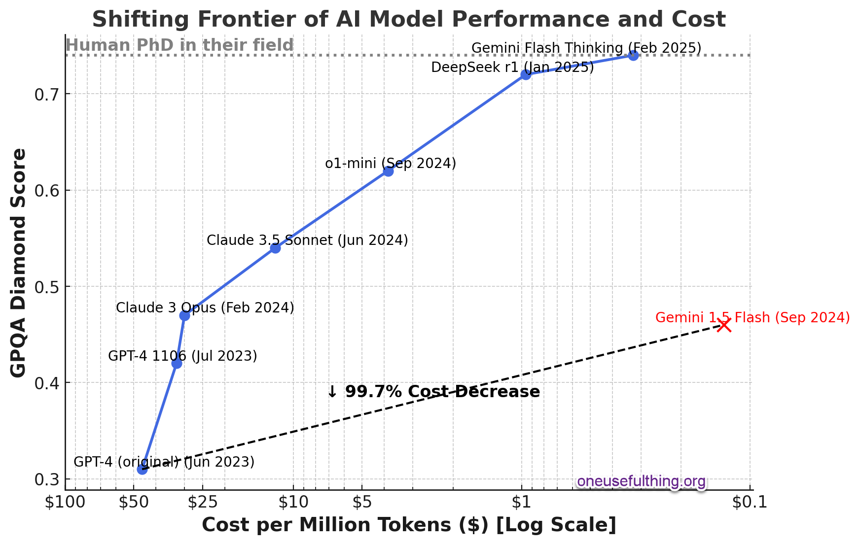 AI capabilities are rapidly improving while costs are exponentially decreasing. The following chart from Ethan Mollick's One Useful Thing shows increasing performance (on PhD knowledge) versus decreasing cost for evolving Models. The rapid improvements in GPT, Claude, and Gemini are charted.